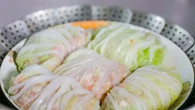 步骤四:将肉馅放在焯水的白菜叶上,叶子左右两边卷上。最后蒸制半小时即可。