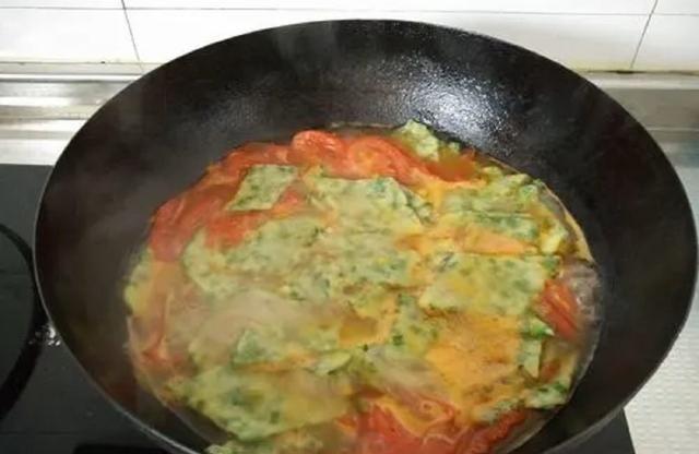 步骤四:加入清水和浓汤宝,此时要用大火烧制。再加入切好的面皮。过一分钟再向锅里打入一颗鸡蛋,等待蛋花形成,美味即可。