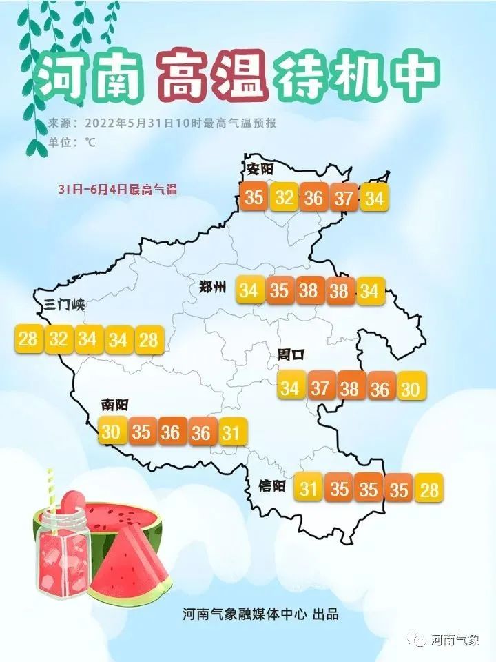 6月1日,南部多云间阴天,信阳南部局部有阵雨;其他县市多云到晴天。中东部最高气温达35℃以上,局部达37℃以上。