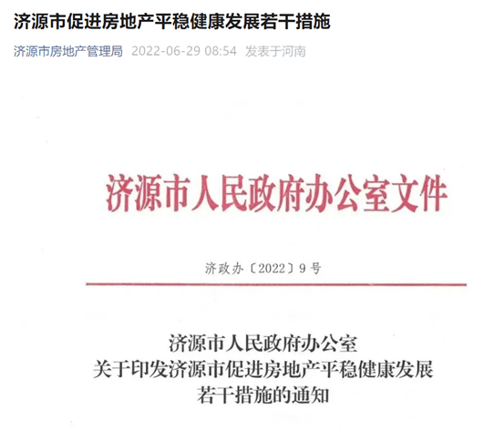 6月29日,济源市房地产管理局发布促进房地产平稳健康发展若干措施,包括加大住房公积金贷款支持力度、降低个人住房消费负担等九方面措施。