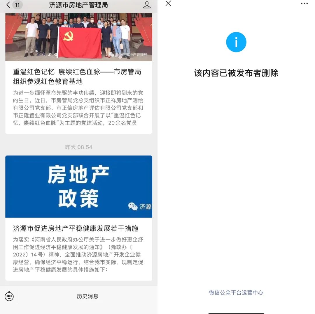 不过,6月30日,澎湃新闻再次打开济源市房地产管理局官方微信号发现,上述政策已显示“该内容已被发布者删除”。