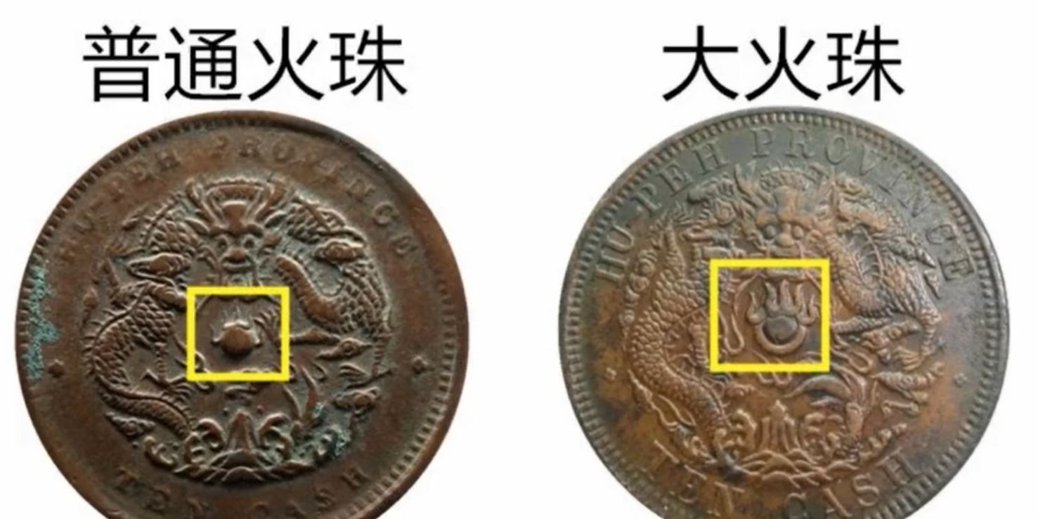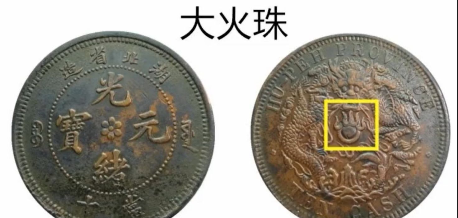 今天和大家要分享的是湖北省的光绪元宝,当十的铜元里面的一个版叫做大火珠版,大火珠版它的版别特征的也和它的名字基本保持一致,就是背面的龙吐出来的火珠非常的大,大家可以看一下大火珠版和普通版的火珠的对比图。