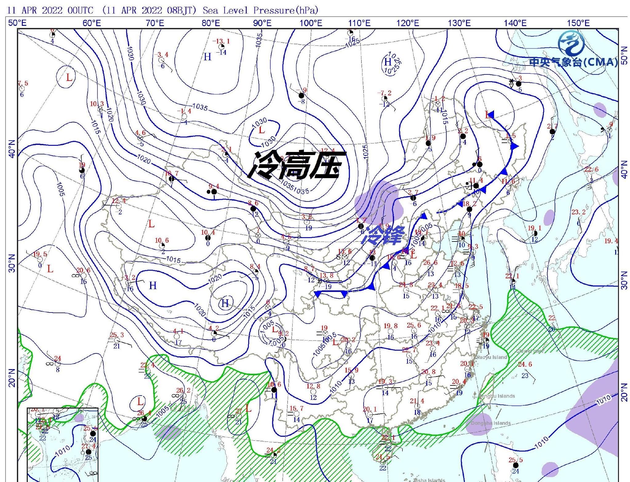 4月11日上午,在我国中东部很多地方继续维持着晴朗炎热的天气氛围时,天气形势的大变化已经悄然开始——北京时间4月11日上午8点,从地面天气图上看西伯利亚和蒙古高原形成了大范围的强盛高压区,高压中心气压超过1037百帕,这是密度大的冷空气大量堆积在近地面形成的冷高压。而一道蓝色锯齿线也已经出现在我国北方多地,这是推进中的冷锋。