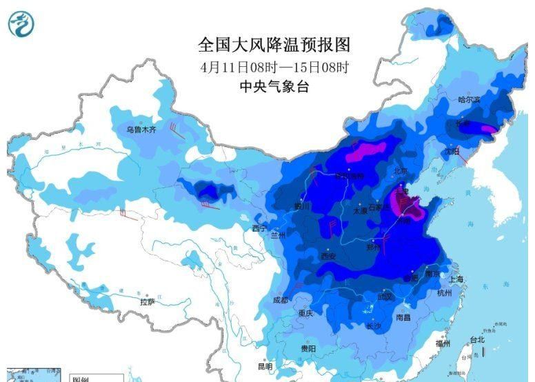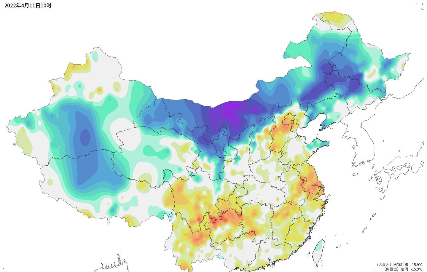 虽然说现在已经进入4月中旬,天气正变得越来越暖和,冷高压的强度已经远比不上隆冬时节,但正在南下的这股冷空气因为有了之前的大升温衬托,带来的降温幅度仍然不可小觑——自4月10日内蒙古东北部和东北部分地区出现降温后,4月11日上午10点,从24小时气温变化图上看,今天我国北方地区降温的区域进一步扩大,西北地区大部、内蒙古、东北三省出现了大范围的降温。