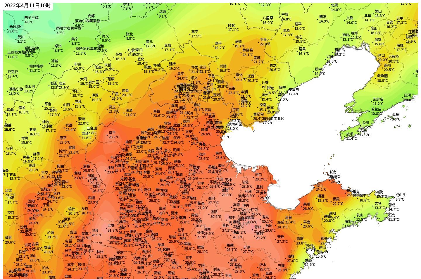 目前,我国长城以南多地还继续处在炎热浪潮当中,4月11日上午10点,山东、河北、河南的不仅气温已经大范围的升到25度以上,更有不少站点接近或是超过30度。毫无疑问,目前是过热的4月,像是刚刚过去的4月10日,河南林州在下午1点前后升到35度,打破了河南省最早高温纪录。