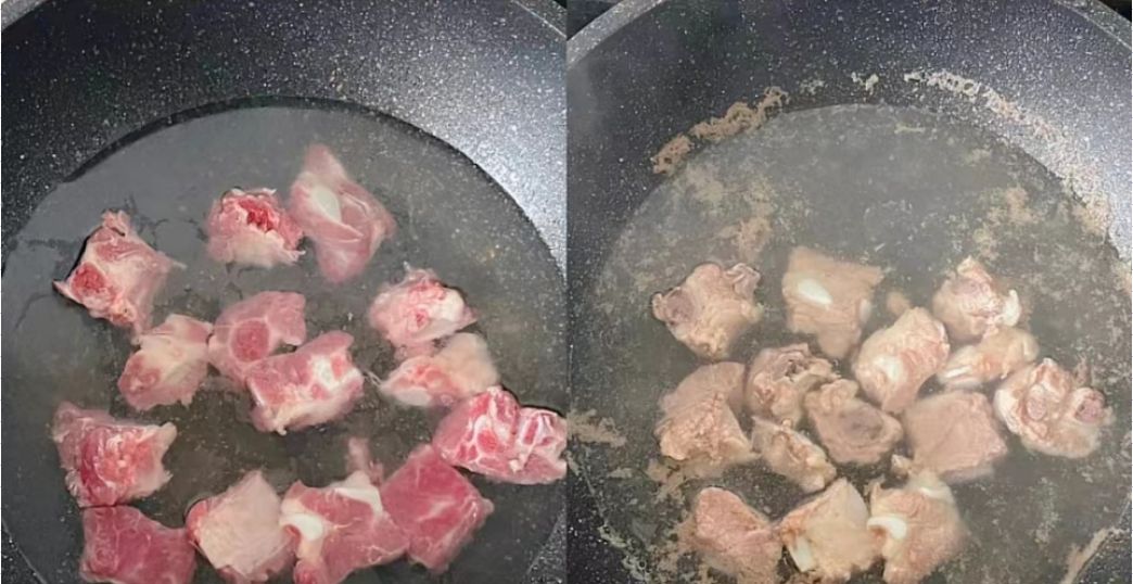 步骤4:排骨剁成一些块状,排骨块用清水冲洗干净,锅中放入排骨块,加上两勺少许,调入料酒和黄酒,大火煮几分钟,去掉排骨腥味,捞出用温水冲洗,控干水分。