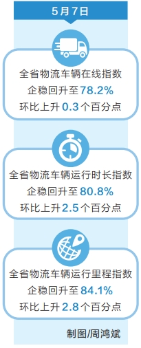 疫情防控关键时期,物流的保障力和敏捷性关系到抗疫的底气。5月9日,记者从省发展改革委获悉,5月7日以来我省物流指数开始回暖,车辆在线指数、运行时长指数、车辆运行里程指数都在企稳回升。