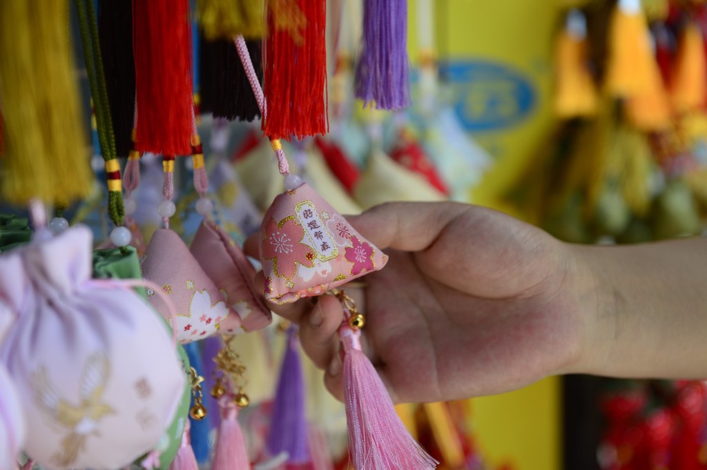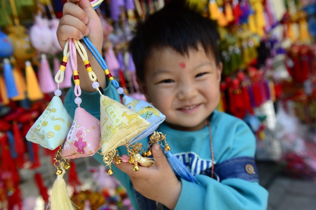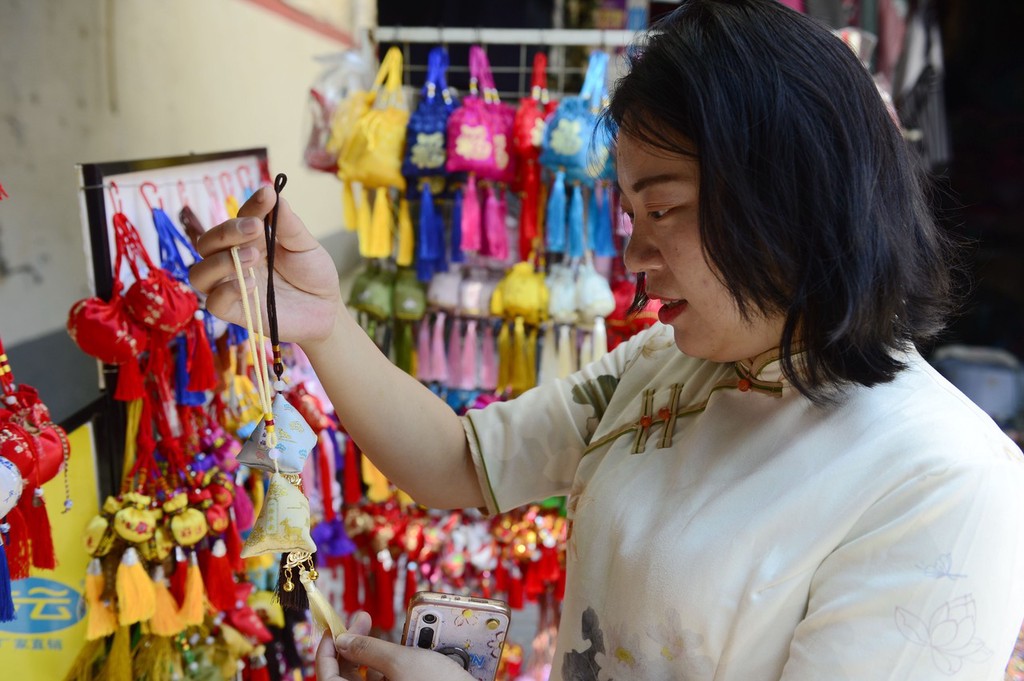 2022年5月21日,河南汝南,端午节临近,当地市场上各种香包饰品纷纷上市,吸引了众多市民前来选购。