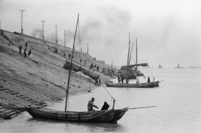 汉口的长江大堤外,停放着的小船,那时候小木船还不少。