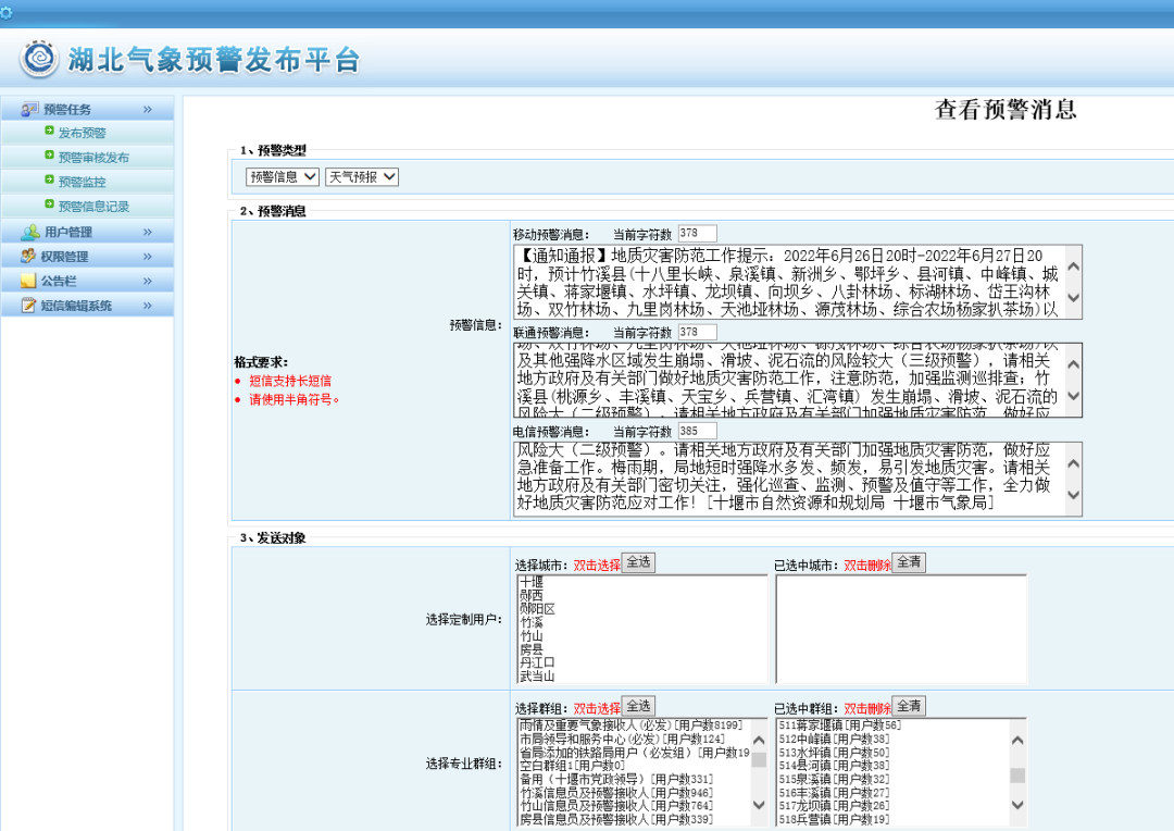 22时37分,市气象台发布暴雨预警信号后,他随即向竹山、竹溪地灾监测网格员发布重要提醒。