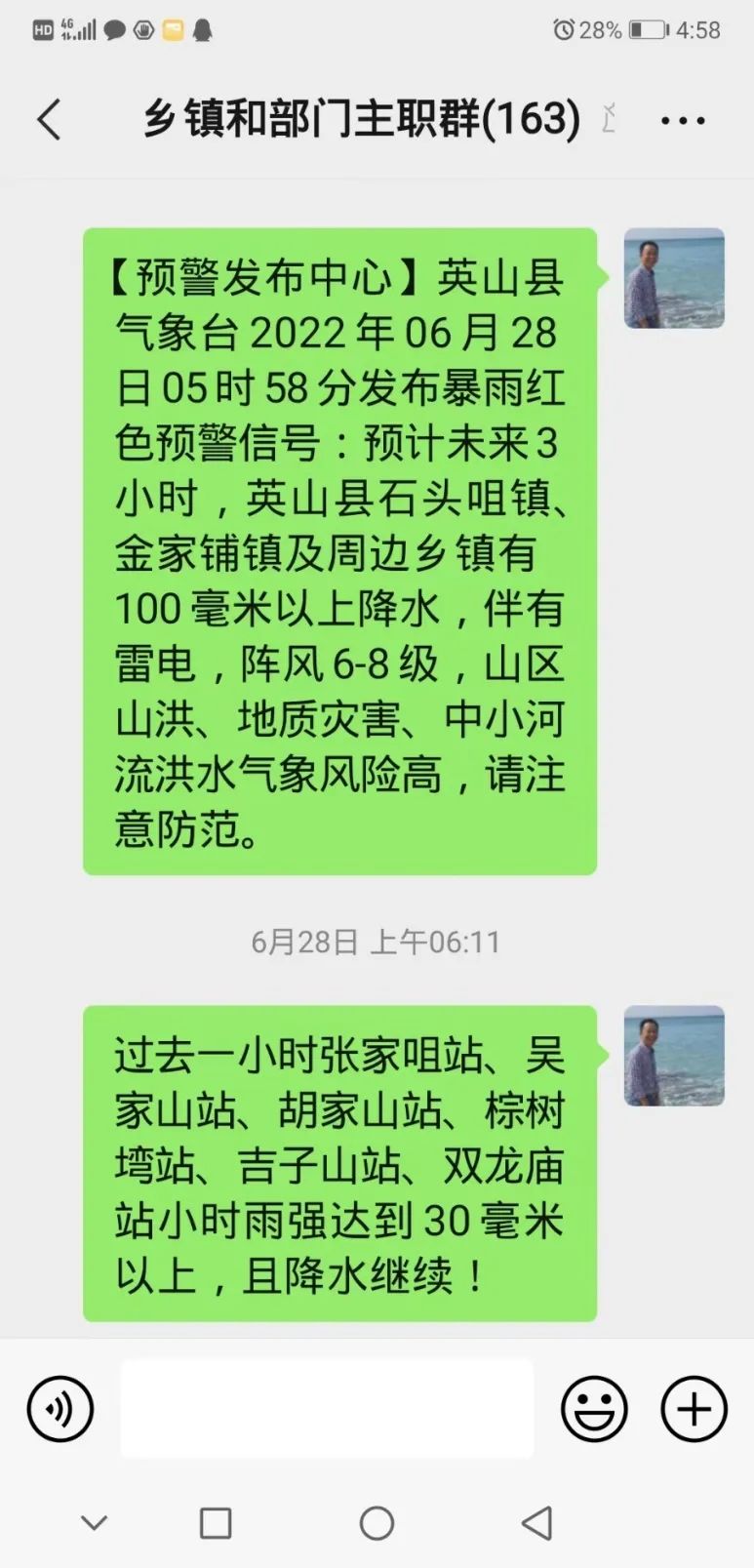 4时25分,余翔进行第二次叫应,汇报“预计英山县石头咀镇、金家铺镇及周边乡镇短时降水将达100毫米以上,山区地质灾害风险较高”,并在黄冈市防汛抗旱工作群及时开展了提醒。