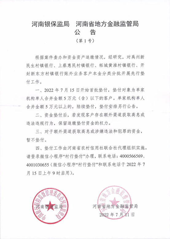 根据案件查办和资金资产追缴情况,经研究,对禹州新民生村镇银行、上蔡惠民村镇银行、柘城黄淮村镇银行、开封新东方村镇银行账外业务客户本金分类分批开展先行垫付工作。