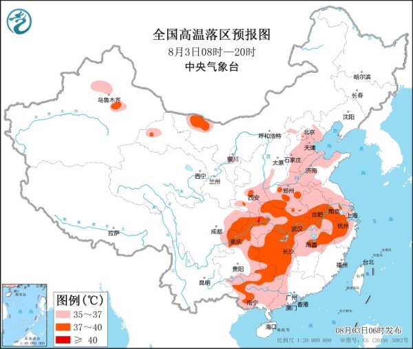 预计8月3日白天,北京平原地区、天津、河北、河南、山东、陕西南部、湖北、安徽、江苏、上海、浙江、江西中北部、湖南、贵州东部和南部、重庆、四川东部、广东西部、广西等地有35℃以上高温天气,其中,河南中南部、安徽中南部、湖北、浙江中西部、江西北部、湖南、重庆、四川东部、广西北部和西部等地部分地区最高气温37~39℃,重庆局地可达40℃以上。
