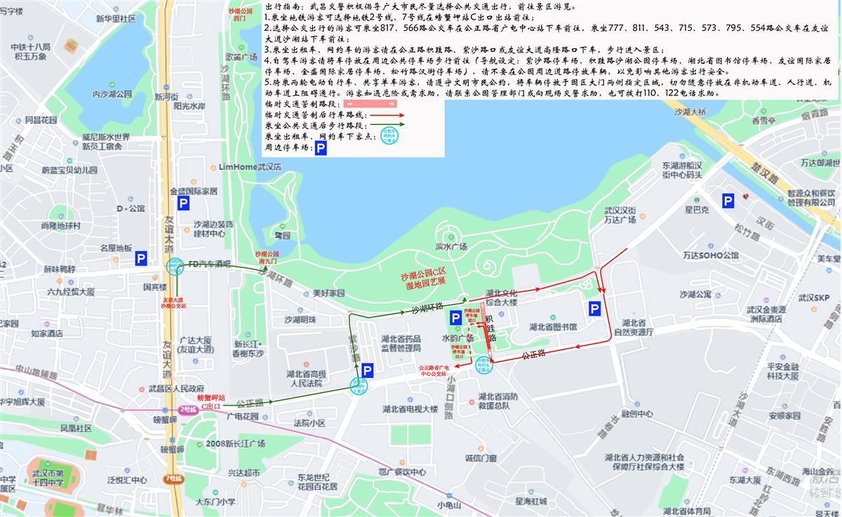4、自驾车游客请将车停放在周边公共停车场步行前往(导航设定:紫沙路停车场、积跬路沙湖公园停车场、湖北省图书馆停车场、友谊国际家居停车场、金盛国际家居停车场、松竹路汉街停车场),请不要在公园周边道路停放车辆,以免影响其他游客出行安全。